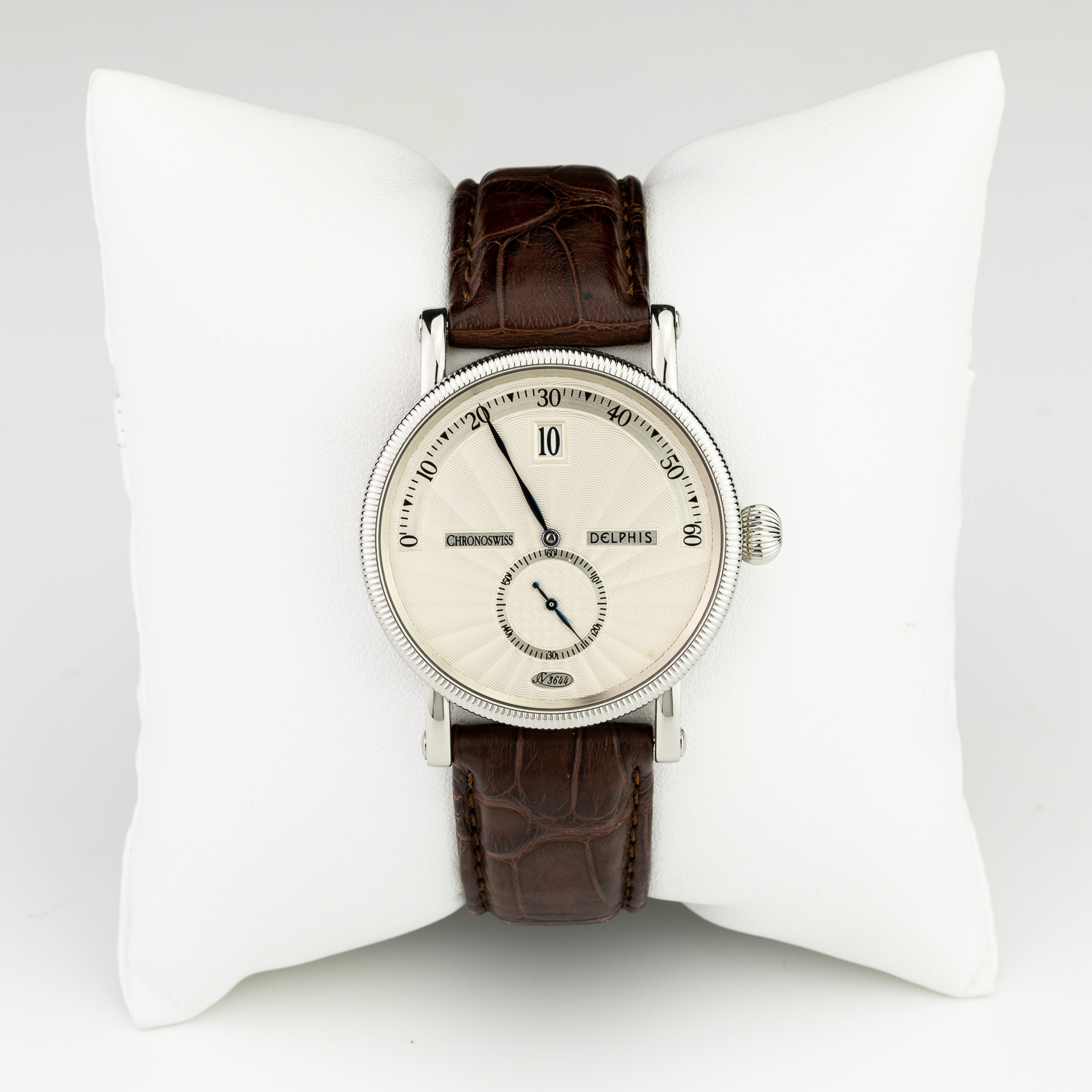 Chronoswiss Delphis stalen horloge, automaat, met bruine alligatorlederen band.